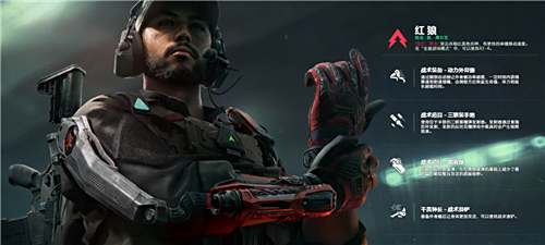 红狼的战术装备为动力外骨骼,通过腕部启动器可让外骨骼功率超载,一定时间内获得移速和射速增幅,击倒敌方后能恢复生命值、体力并延长超载时间。他的战术道具包括三联装手炮和烟雾弹,三联装手炮通过食指拉环发射反坦克榴弹,命中载具时会产生吸附效果;烟雾弹则为突破用短时烟雾弹,在经典烟雾弹基础上减少了装药量,能短暂且灵活地遮蔽视野。