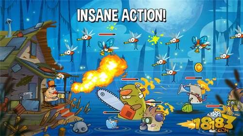 只是许久未闻的嘈杂声音引来了沼泽里的原住民,一大波造型可爱的鳄鱼、浣熊、乌龟、蚊子等生物成为了来犯的敌人,玩家需要在类似《植物大战僵尸》的横版地图中,控制大叔拿起枪支,点击屏幕开火退敌。各类生物拥有不同的血量和移动速度,玩家需要优先处理棘手的对象,免得成群而来时手忙脚乱。