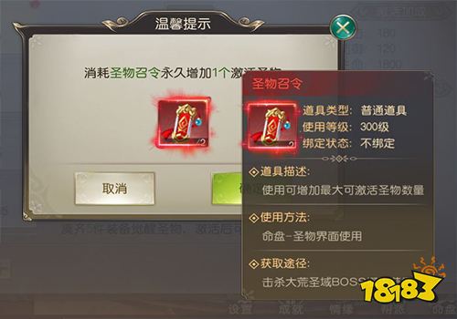当满足5个圣物装备品质要求,即可激活该圣物,获得圣物装备、圣物、圣物技能的属性加成。挑战的BOSS等级越高,掉落的圣物装备品质越高,便越容易激活高级圣物。 每个角色初始能激活3个圣物,通过消耗“圣物召令”能开启额外的圣物槽位。需要注意的是,圣物召令会在大荒BOSS随机掉落哦,只要你人品够好!